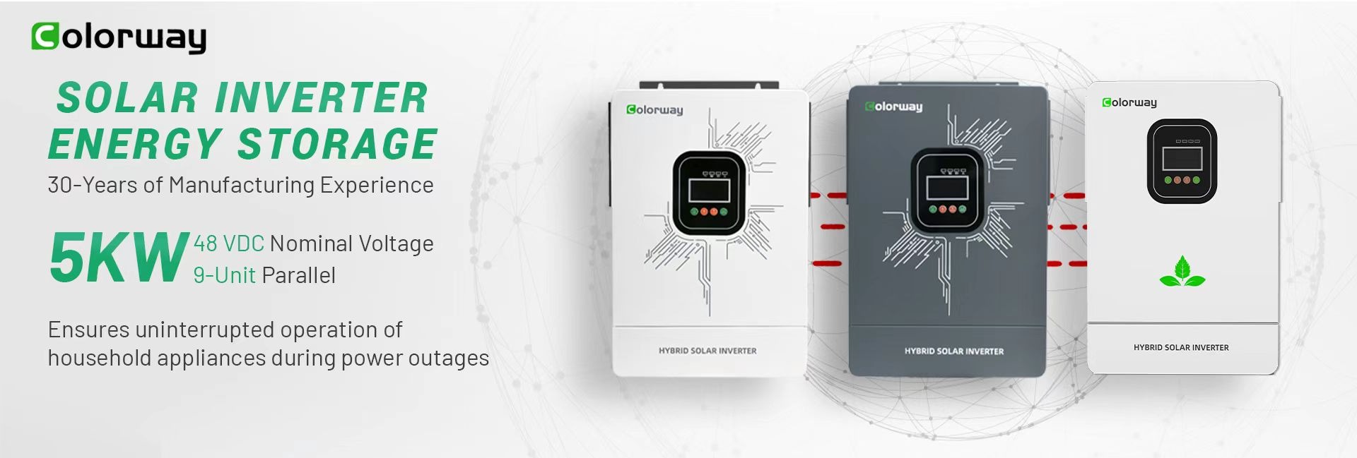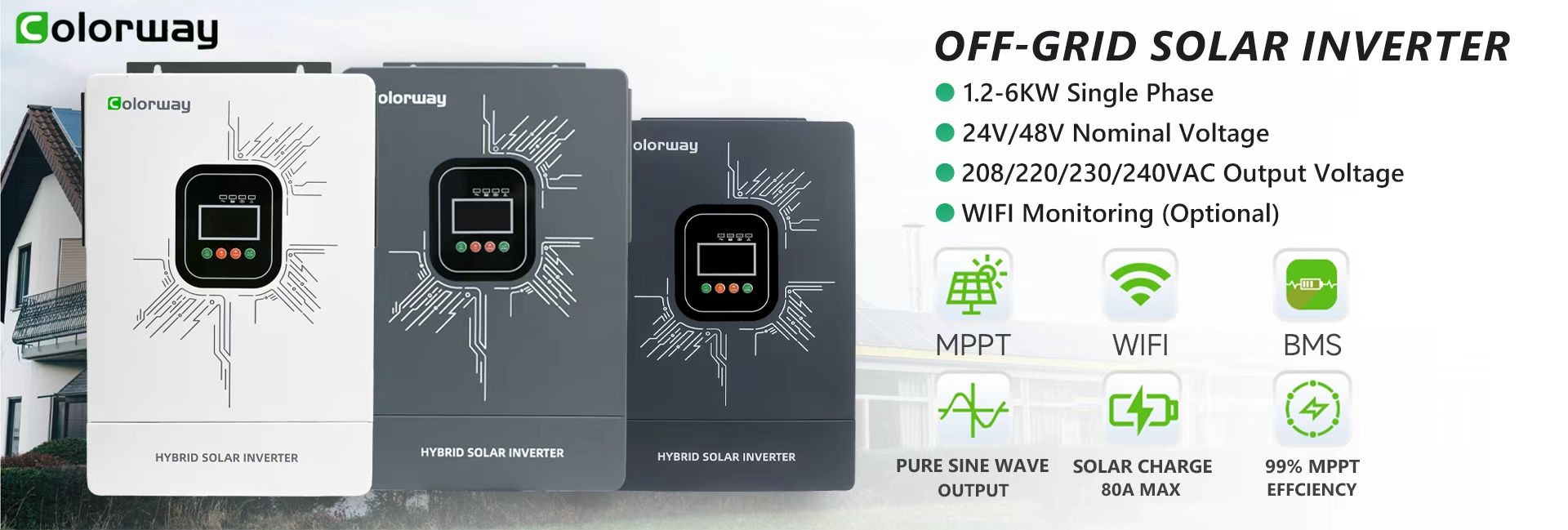 Colorway อินเวอร์เตอร์พลังงานแสงอาทิตย์6.2kW บริสุทธิ์แบบเฟสเดียวที่มีประสิทธิภาพ99.9% สำหรับระบบไฮบริด/ออฟกริด24โวลต์